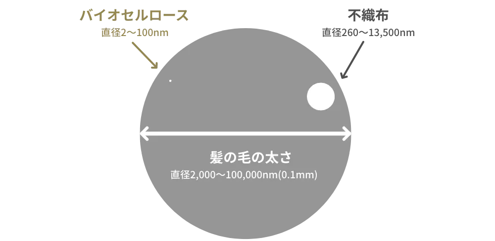 バイオセルロース繊維は、髪の毛の約1000分の1、保護シートの約133分の1です。