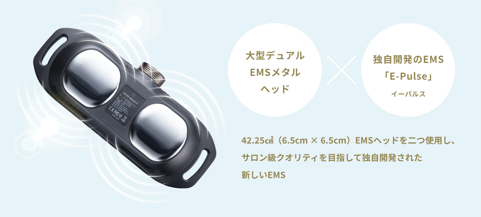 ジェル不要の「大型デュアルEMSメタルヘッド」と独自開発されたサロンクオリティのEMS「E-PULSE」を搭載し、広範囲に下腹部、太もも、ヒップ等の筋肉にアプローチし、効率よく、気になる箇所のケアを行います。